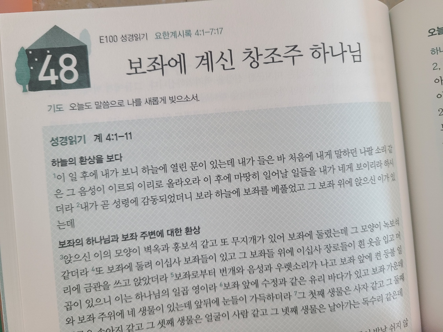 - 네 생물의 찬양(“거룩하다, 거룩하다, 거룩하다”)은 하나님의 완전한 본성과 영광을 묵상하게 합니다. 이는 우리의 예배가 하나님 중심적이어야 함을 일깨웁니다.